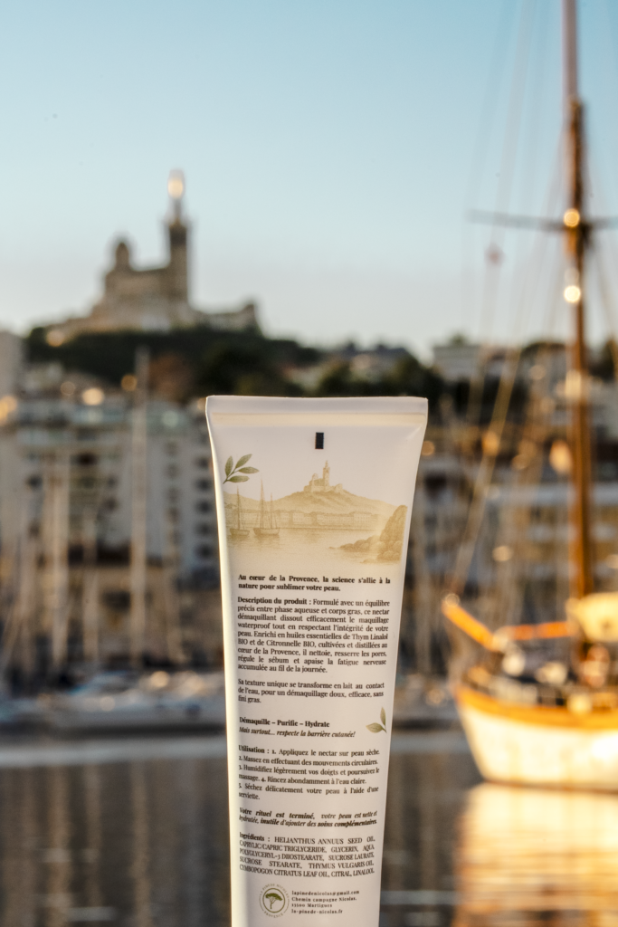 L’identité visuelle du produit s’appuie fortement sur son ancrage provençal. Le packaging en donne déjà plusieurs indices : la Bonne Mère de Marseille dessinée sur le tube, des teintes sable et chaleureuses qui rappellent les façades ensoleillées de la ville, et un vert naturel évoquant la végétation méditerranéenne.